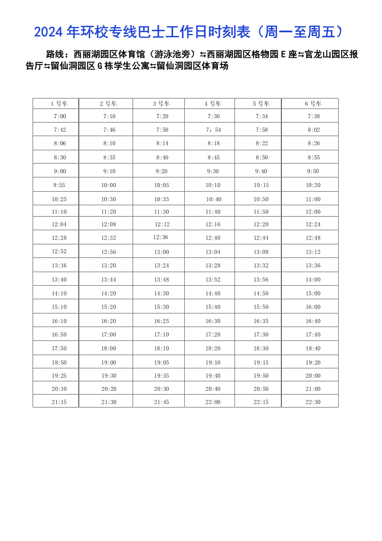 2024年環校專線巴士工作日時刻表(周一至周五)