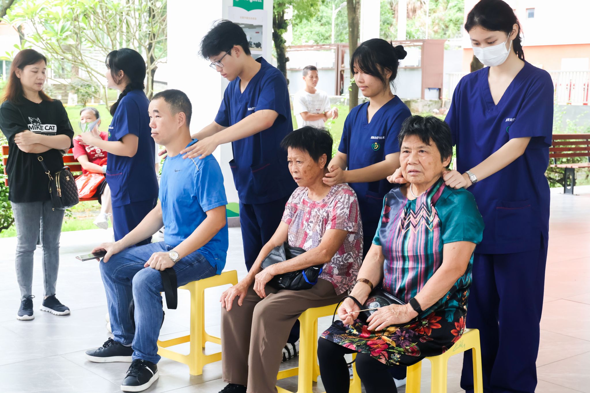醫(yī)護學(xué)院現(xiàn)場提供測血壓、測血糖、耳穴壓豆及推拿按摩等服務(wù)。