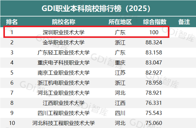 4月28日,廣州日報數(shù)字化研究院(GDI智庫)發(fā)布“GDI職業(yè)本科院校排行榜(2025)”,對全國(不含香港特別行政區(qū)、澳門特別行政區(qū)和臺灣地區(qū))全部本科層次職業(yè)學校進行綜合評估,我校以綜合指數(shù)100分拔得頭籌。