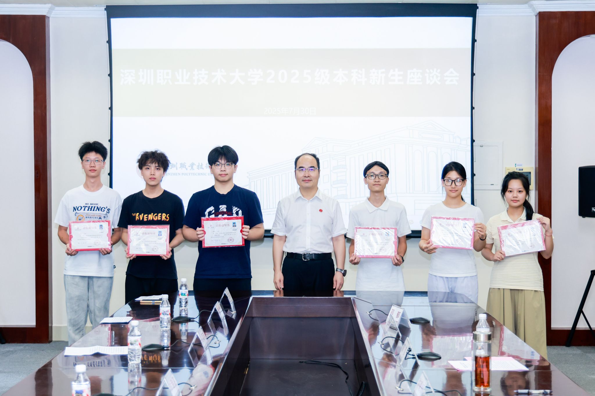 7月30日,深圳職業技術大學2025級本科新生座談會在明德樓101會議室舉行。學校黨委副書記、校長許建領與6名來自陽江市第一中學、深圳中學、深圳外國語學校、深圳市福田區紅嶺中學、深圳市寶安中學等學校的新生代表座談交流。學校相關二級學院及職能部門負責人參會,招生就業辦公室主任崔蓮主持會議。