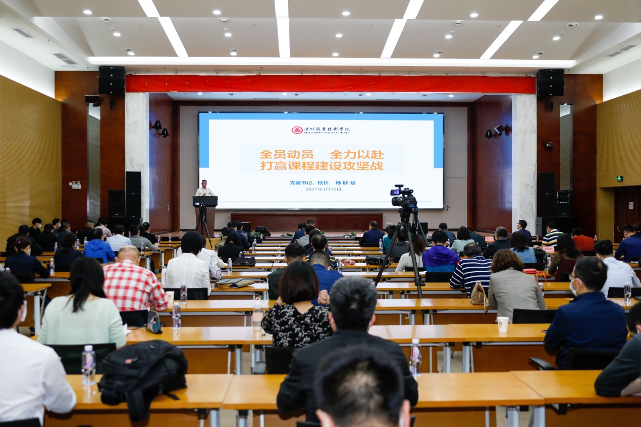 楊欣斌作題為“全員動員,全力以赴,打好課程建設攻堅戰”的主題報告,從問題與現狀、目標與思路、任務與舉措、實施與保障四個方面進行了動員報告。他首先介紹了“金課”建設背景、我校課程建設取得的主要成績和面臨的問題,重點分析了“金課”的內涵、建設原則和目標,隨后提出學校“金課”建設“十個一工程”即完善一套標準,挖掘課程內涵;構建一種機制,校企深度融合;鍛造一支隊伍,教師全員培訓;建設一批資源,多主體多樣化;開發一批教材,新形態立體化;打造一個平臺,建用學管一體;推動一場革命,打造有效課堂;培育一批品牌,瞄準世界一流;探索一種范式,強化課程研究;積淀一批成果,示范輻射引領。最后,楊欣斌表示,“優質課程是成就學校世界一流的‘基中之基、核中之核、重中之重’!建設高質量的課程是每一位老師的天職、第一任務”,要明晰路徑、統籌規劃,從組織、經費、制度等方面保障“金課”建設的順利推進。