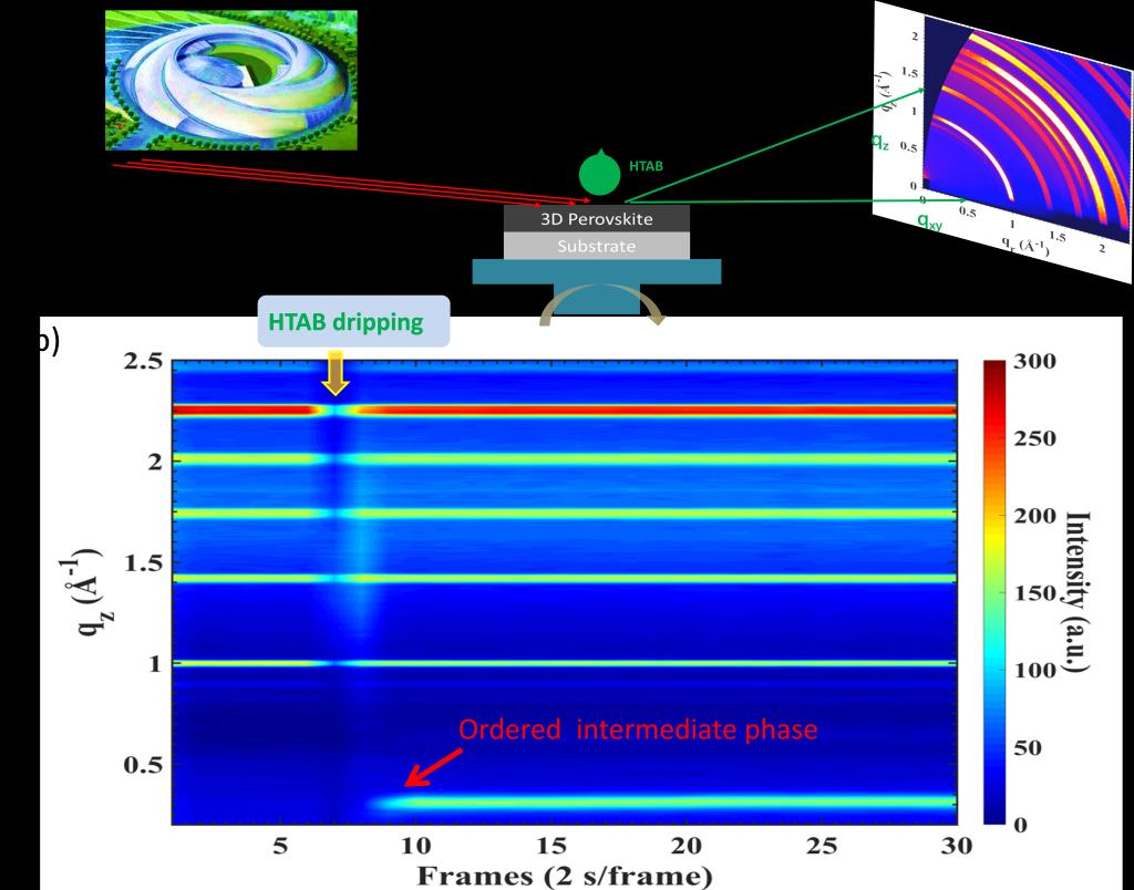 近日,我校霍夫曼先進材料研究院諾獎團隊在利用高能同步輻射對鈣鈦礦量子阱的形成機理研究領域取得重要進展:研究團隊采用高能掠入射角X射線衍射實時表征了在三維鈣鈦礦表面通過旋涂長鏈有機銨鹽溶液法所制備鈣鈦礦量子阱形成過程,明確了與長鏈有機銨分子發生反應的反應物;并通過追蹤反應產物在熱退火前后的晶體結構演變,探究了鈣鈦礦量子阱形成過程的具體路徑。這一研究成果發表在材料領域國際頂尖期刊《先進材料》(Adv. Mater., 2020, DOI: 10.1002/adma.202006238)上,論文第一作者為霍夫曼先進材料研究院胡漢林副教授,深圳職業技術學院為論文第一完成單位。