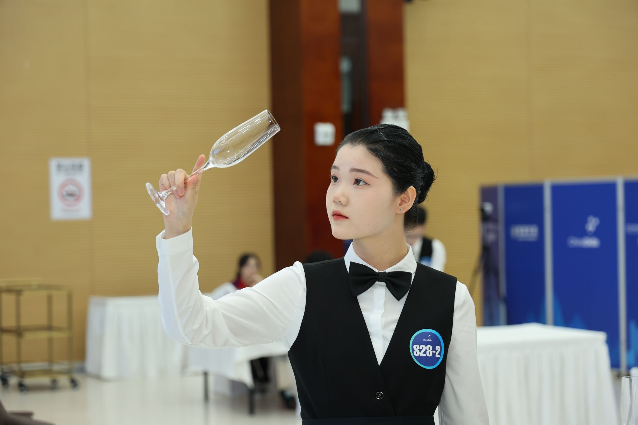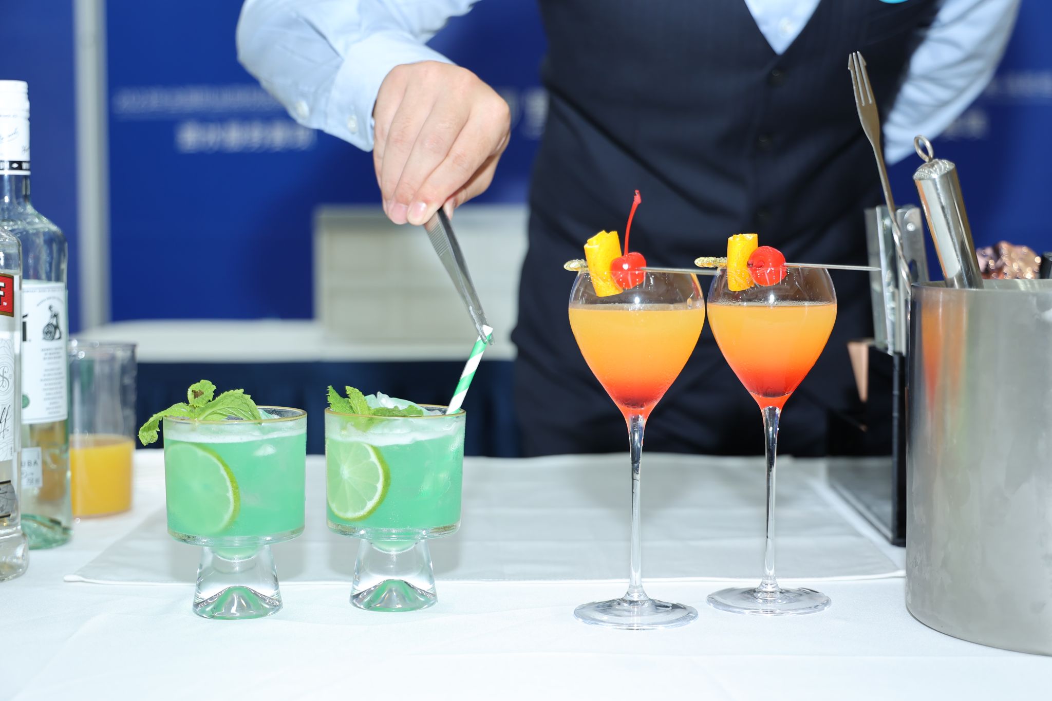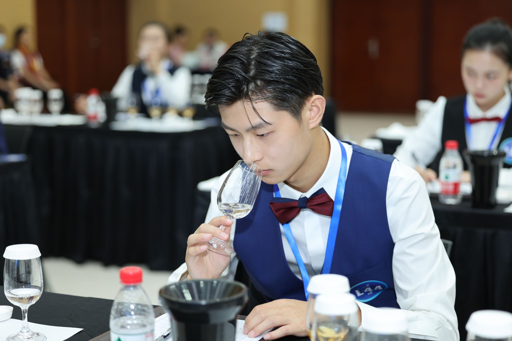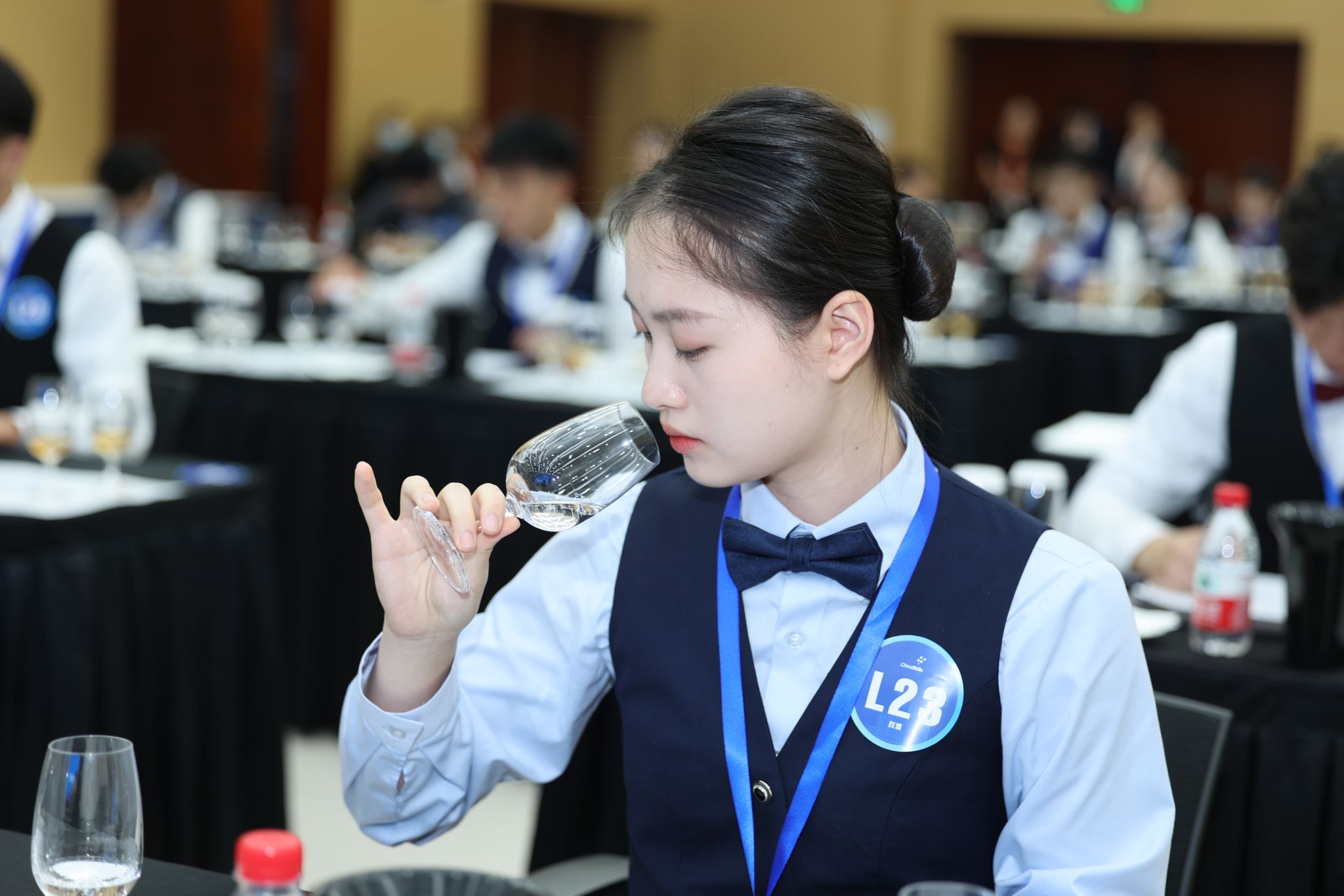 大賽過程中,各參賽隊圍繞酒水品鑒與侍酒服務、雞尾酒調制與服務及綜合能力測評三個模塊同臺競技,切磋技藝。酒水品鑒,即現場品鑒5款白葡萄酒、5款紅葡萄酒,并寫出國家及產區、葡萄品種、顏色、香氣特征、單寧、酸度、甜度、酒精度等口感特征。現場品鑒10款烈酒,并寫出烈酒的品種、主要原料、國家與產地。侍酒服務,即采用侍酒情景模擬形式,選手完成酒杯擺臺、老酒開瓶、潷酒、試酒、斟酒、分酒。雞尾酒調制與服務,即完成兩杯自創雞尾酒的制作及服務。綜合能力測評,即完成單選題和營銷活動方案設計。