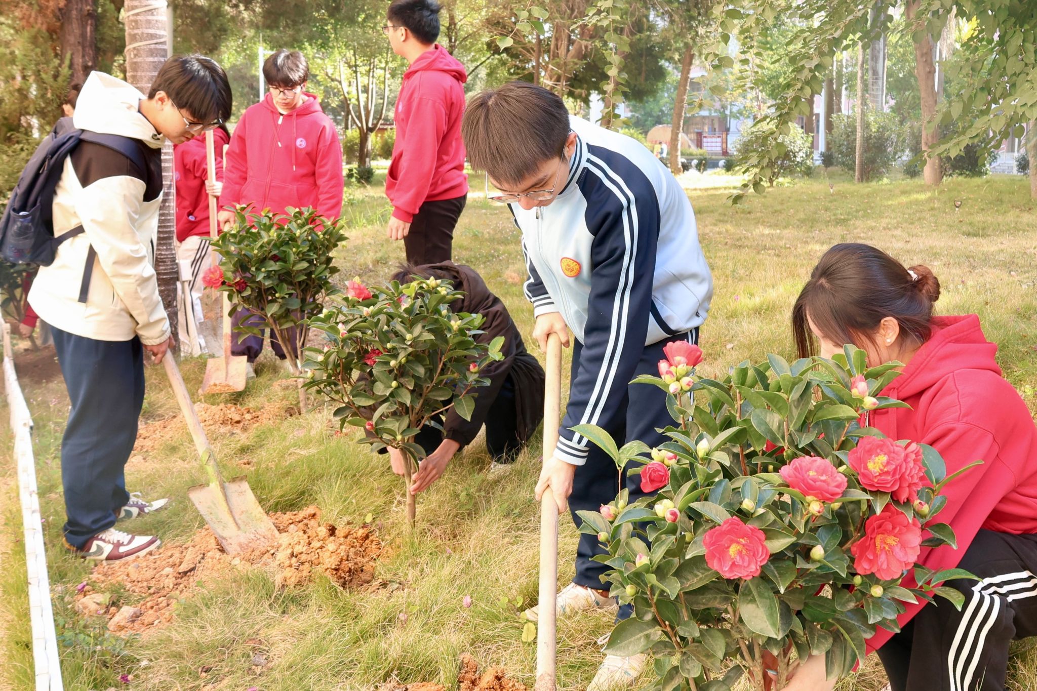 兩校學子還共同種植了一片青年林。在植樹現場,兩校的學子們揮鋤鏟土、澆水培苗,每一鏟土都蘊含著對未來的希望,每一滴水都滋潤著青春的夢想。青年林不僅見證了兩校之間的深厚友誼,更寓意著青年學子攜手共進,為實現綠色、低碳、可持續的發展貢獻自己的力量。